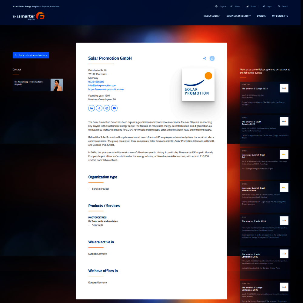 Present your company internationally! With a company profile in the business directory of The smarter E Digital, you reach a global audience and benefit from maximum visibility.