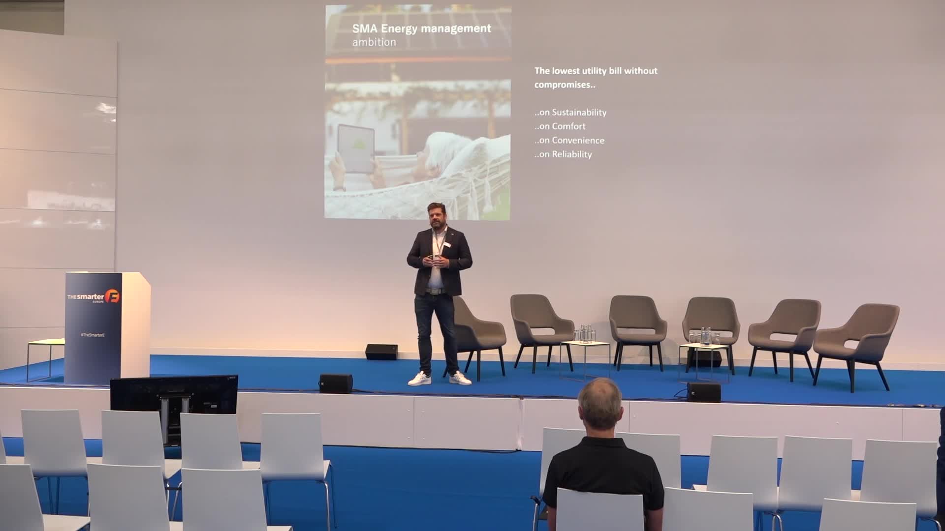 Bart van Remortel, the solution manager for SMA's home residential energy management solutions, discusses the company's new developments and aims in energy management at The Smarter E event. Their primary goal is to reduce utility bills without compromising comfort or sustainability. They achieve this by optimizing the use of solar energy and ensuring systems are user-friendly and reliable. Key announcements include advanced functionalities in their existing system: improved yield with over-dimensioned PV plants, compliance with Germany's Paragraph 15A legislation affecting grid capacity while maintaining comfort levels, and support for dynamic pricing facilitated by smart meters. Bart van Remortel emphasizes that efficient energy management involves two main aspects: high efficiency and intelligence. This includes handling fluctuating prices effectively through products like Sunny Home Manager, which has been widely adopted. Future trends involve further legislative changes aimed at managing peak demands on the grid more efficiently and utilizing smaller consumer contributions to balance it as virtual batteries for TSOs (Transmission System Operators).